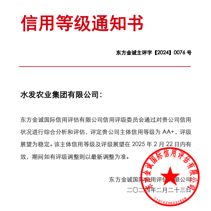 水發(fā)農(nóng)業(yè)集團榮獲AA+主體信用評級